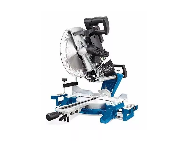 - Tête de scie inclinable des deux côtés et plateau orientable permettant de réaliser facilement des travaux exigeants avec la plus grande précision grâce au laser de matérialisation de la ligne de coupe.